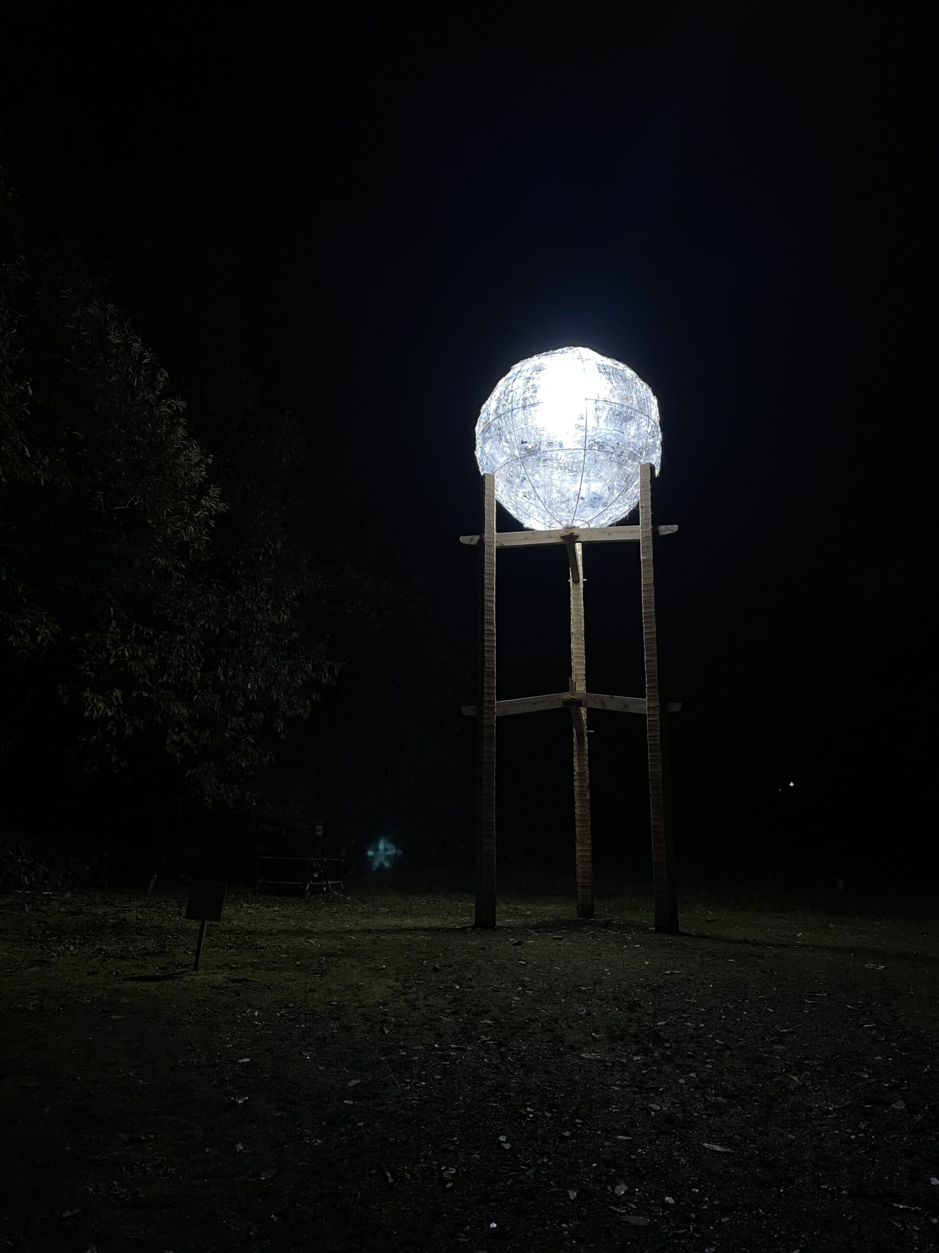 トークショーが終わり、会場とお二人の記念撮影が終わり外へ出る頃には夜がすっかり深まっていました。私は夜の野外展示を見に暗い道を歩いて行き作品を鑑賞しました。ムーンライトが煌々と輝いているのを確かめて帰路につきました。
