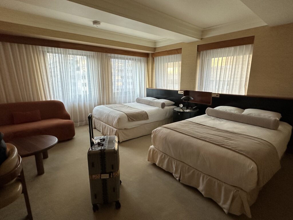 ホテル選びで最後まで迷ったのが部屋の広さです。 「寝るだけなら28㎡で十分」と思いがちですが、あえてソファとローテーブルのある38㎡の部屋(キタノホテル)にアップグレードしました。